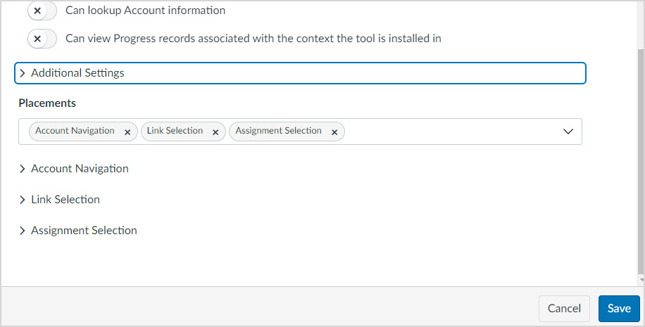 TIP: The Account Navigation placement isn't required for assignment links or grade pushing. It controls the visibility of the Möbius tool in the Admin menu (for single sign-on for Canvas administrators).