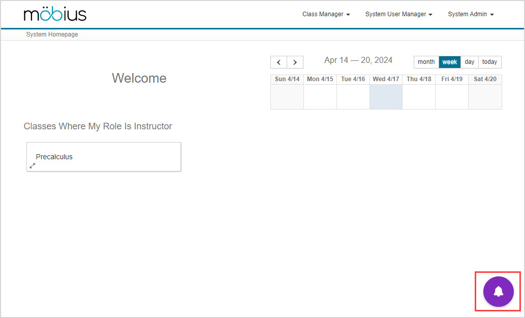 Mobius System Homepage with the Notifications icon in the bottom right corner.