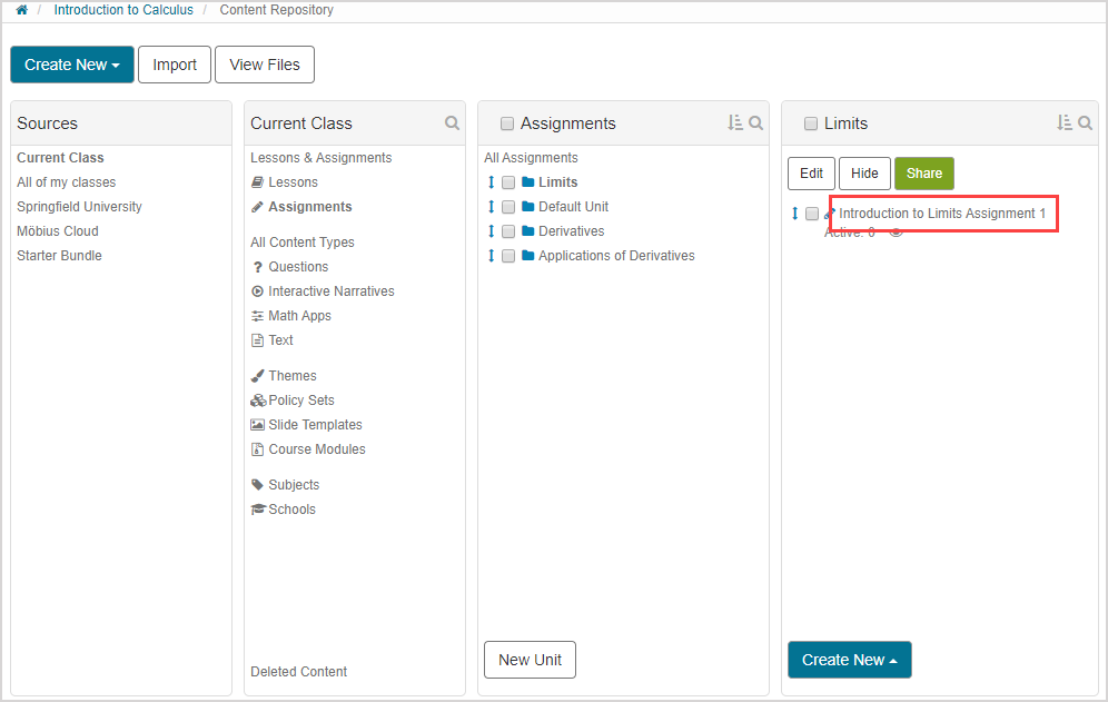NOTE: You won't be able to edit any component of an assignment in a parent class if there are active attempts within a related child class. You'll need to investigate the Content Repository of each child class to see if there are any active attempts that require force grading (check out Force grade an activity). Once these attempts are force graded in the child class(es), you'll be able to resume with editing the assignment.