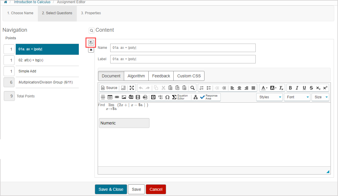IMPORTANT: After making your edits to a question in the Question Editor, be sure to click the save icon. Your edits to questions will not be saved without clicking this icon. If you fail to click this icon before leaving the Question Editor, a warning message will appear stating that your changes will not be saved. Click Cancel to return to the Question Editor and then click the save icon.