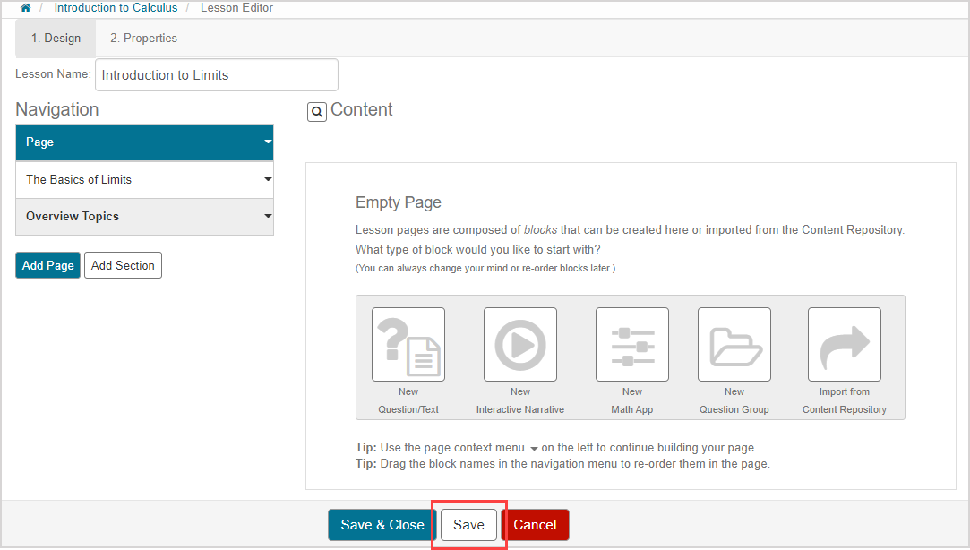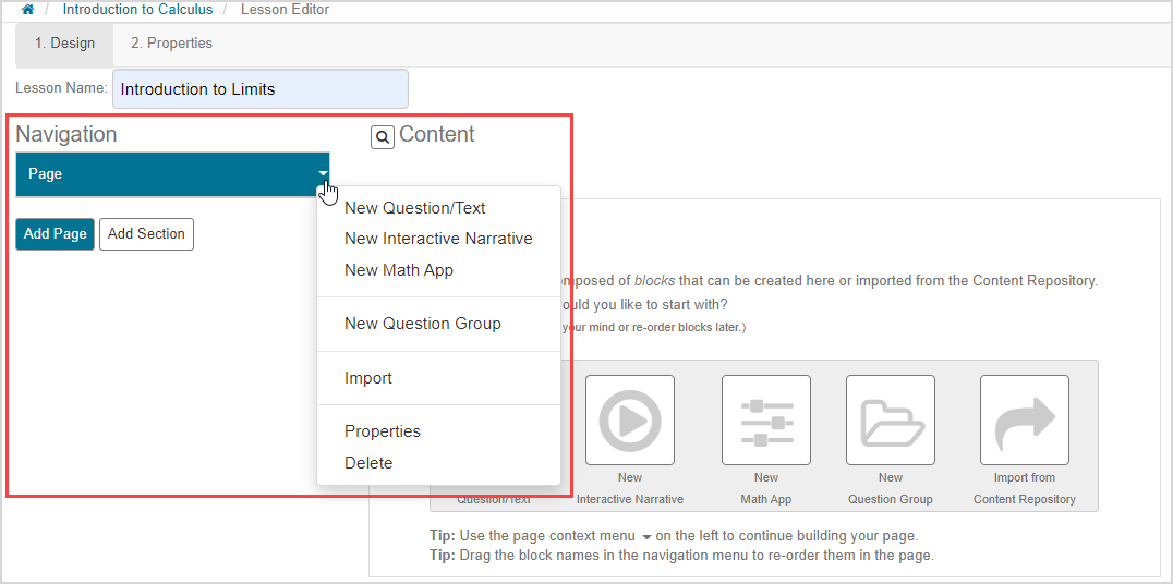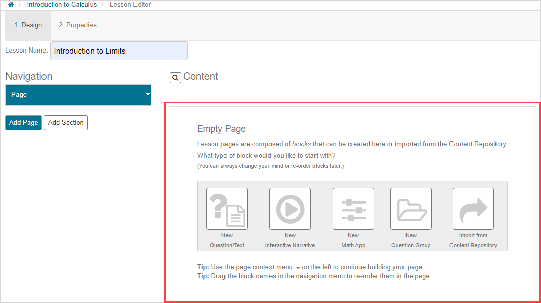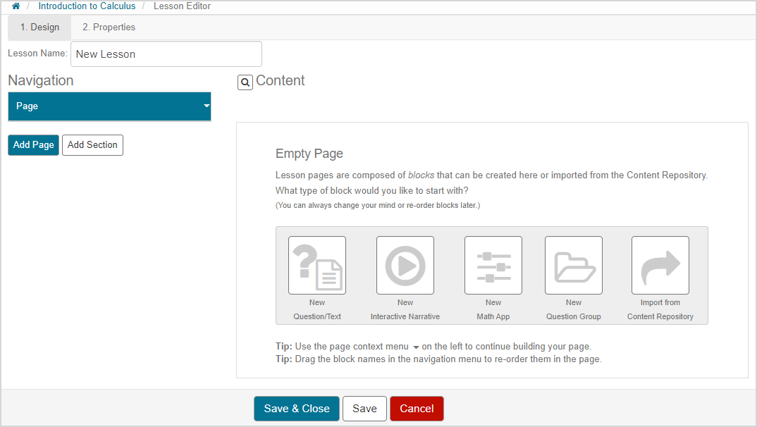 TIP: You can author new content blocks in the Lesson Editor or import content blocks from the Content Repository.