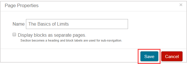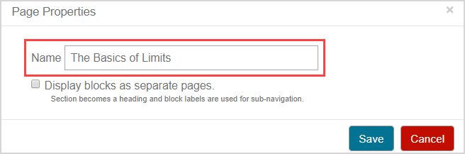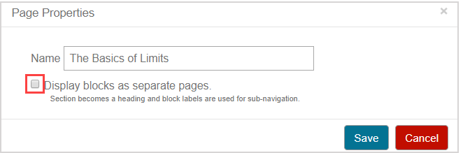 NOTE: If content blocks are to display as separate pages, they change from italicized text to plain text in the Navigation pane. When building a lesson page, the entire page is displayed as a series of previews of the individual page content blocks, regardless of choosing to display the content blocks as separate pages.