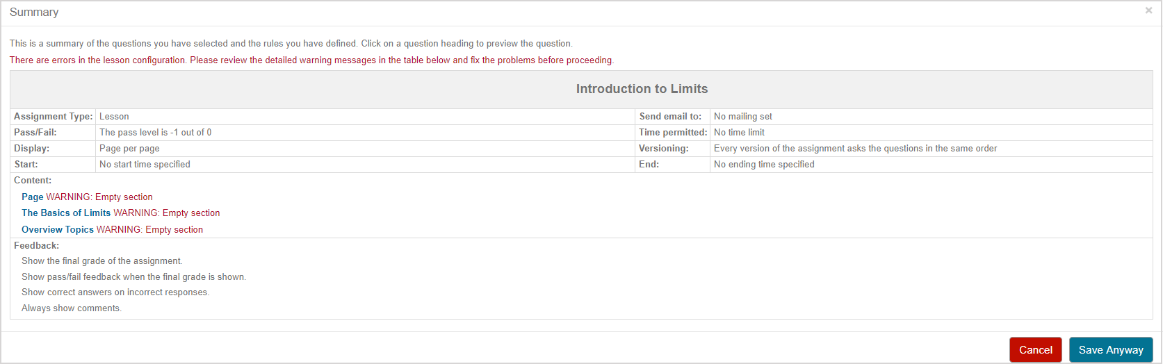 Click Cancel in the Lesson Summary page to return to the Design tab where you can resolve the issues.