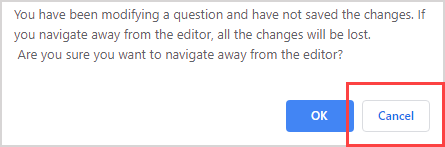 If you make changes to the content and then click another function (ExampleSave & Close), you will be prompted with a warning message that you have not saved the changes to your content. Click Cancel to return to the Lesson Editor so that you can save your content changes.