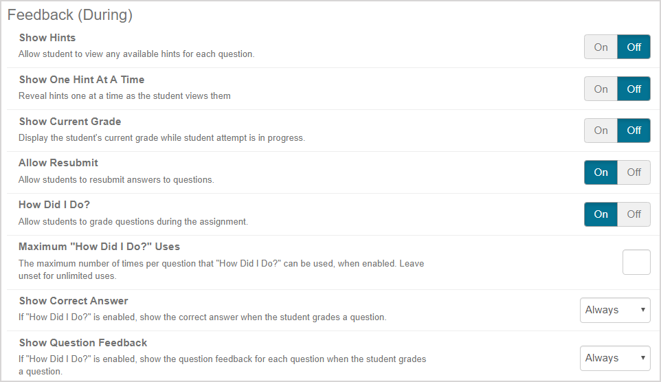 Enabled — A maximum number of times per question that a student can use the How Did I Do? function.