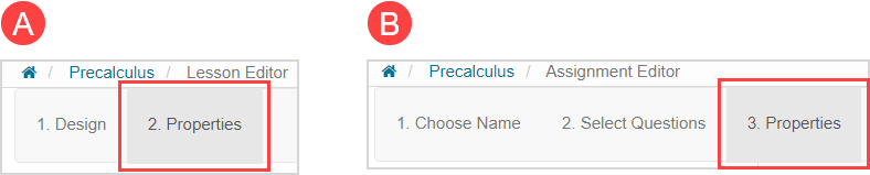 Navigate to the (A) 2. Properties tab of the Lesson Editor for your lesson or the (B) 3. Properties tab of the Assignment Editor for your assignment.