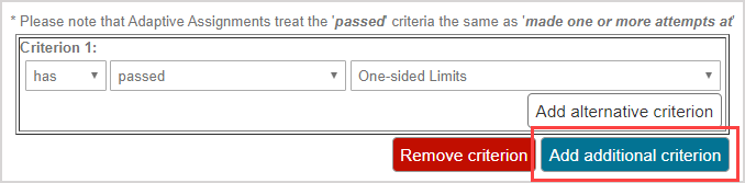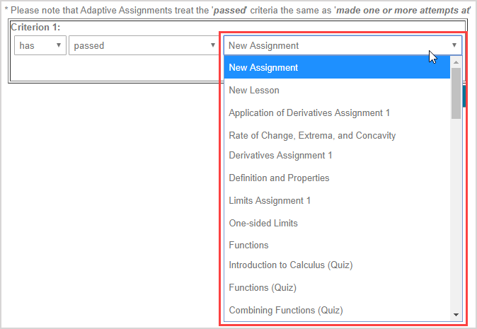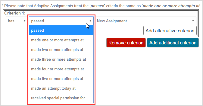 NOTE: Adaptive Assignments treat the passed status as made one or more attempts at.