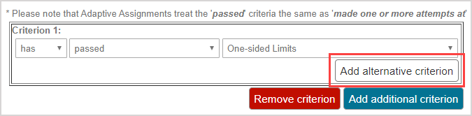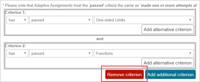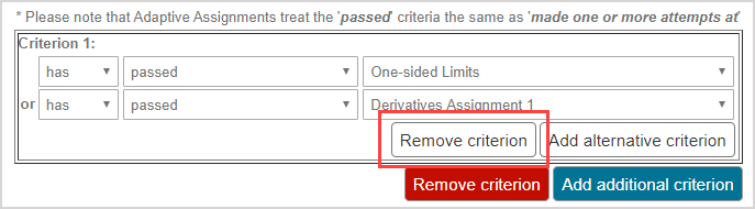 TIP: Delete an alternative criterion by clicking Remove criterion within the desired criterion frame. The criterion listed last in that frame is removed.