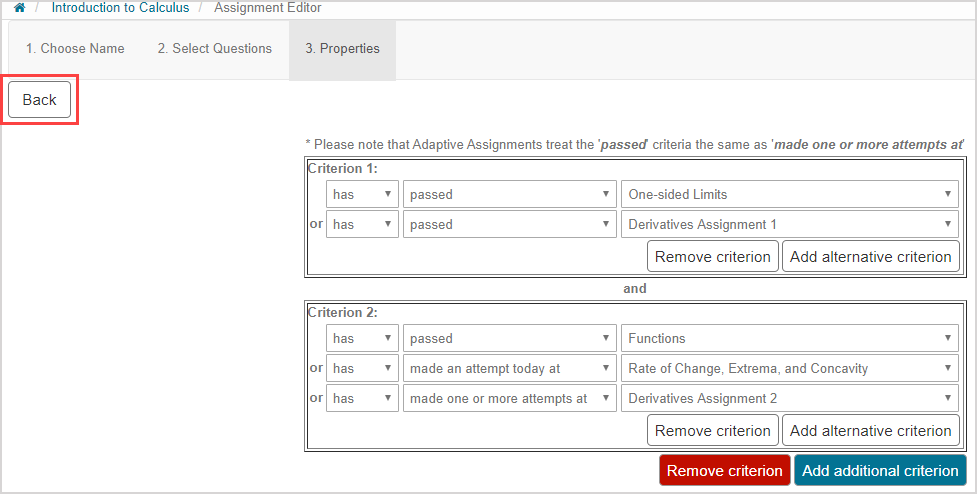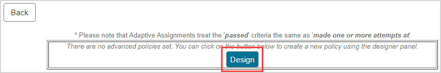 1. Click Back to save the changes you have made to the Advanced Policies criteria and return to the Properties tab of the Lesson or Assignment Editor.