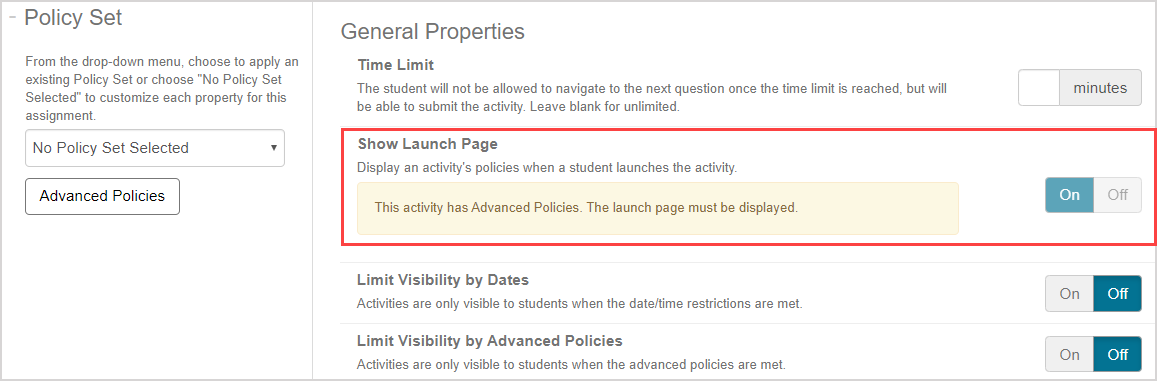 NOTE: Defining Advanced Policies means that your activity must display the launch page when a student begins their attempt. A message appears that notifies you of the Show Launch Page property being automatically set to On.