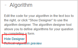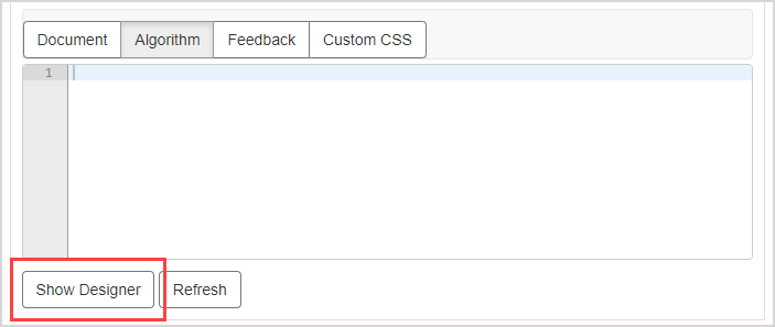 The Show Designer and Hide Designer buttons function the same in the Lesson or Assignment Editors, but are located below the Algorithm Editor.