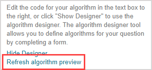 TIP: Click Refresh algorithm preview (or Refresh if using the Algorithm Designer in the Lesson or Assignment Editors) as many times as needed to see examples of what values would be generated based on your new algorithmic command.