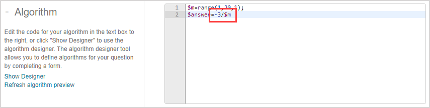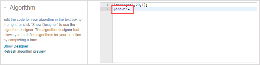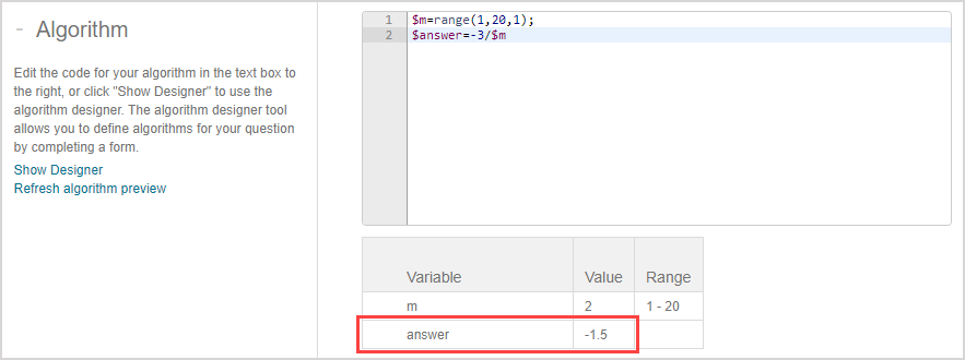 Click Refresh algorithm preview (or Refresh if using the Algorithm Designer in the Lesson or Assignment Editors) as many times as needed to ensure that the values that are derived for your defined correct answer variable display as expected.