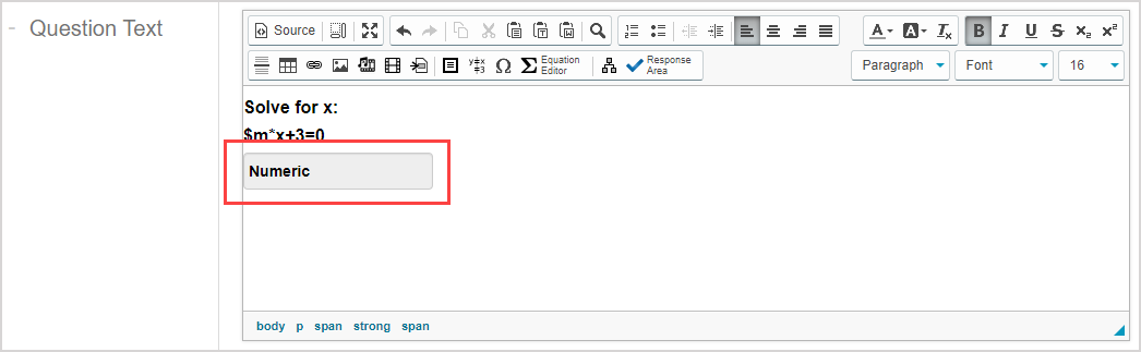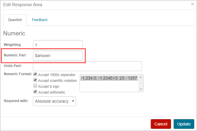 While authoring a question and defining the correct response, you can include the algorithmic variable in the answer field to give the correct answer, or include it in other fields of the student response component: