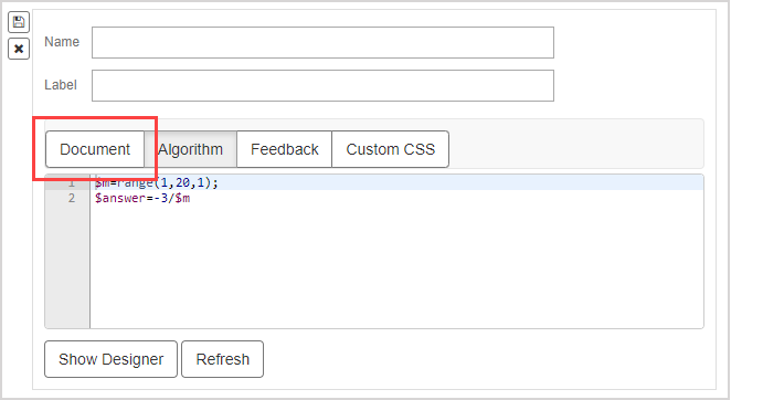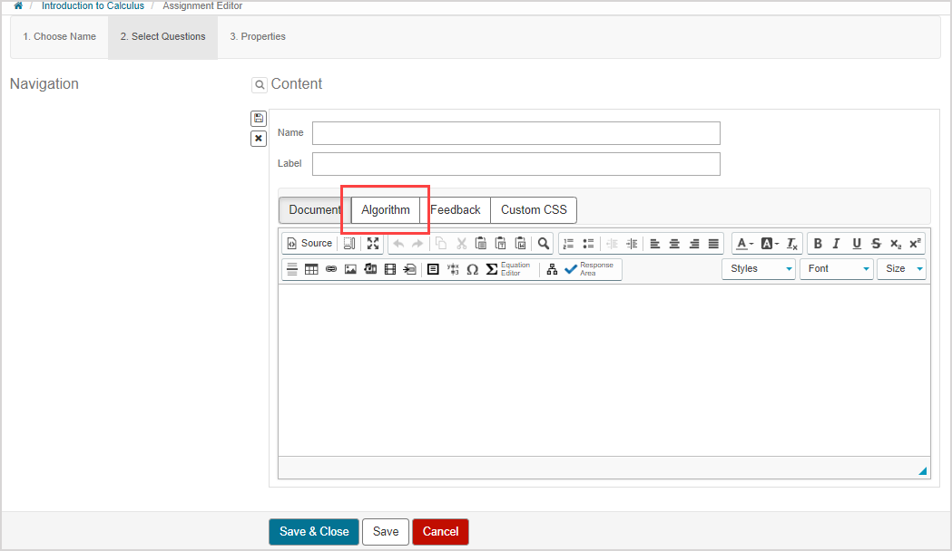 NOTE: When working with a question in the Lesson Editor or Assignment Editor, the Algorithm Editor is stored within a panel of the Question Editor. Click the Algorithm tab to reveal the Algorithm Editor.