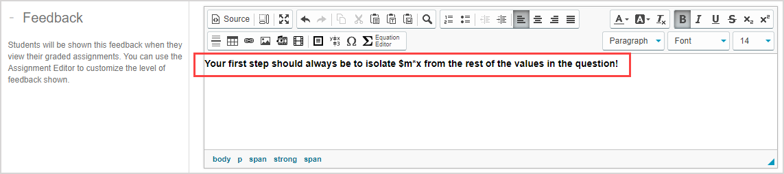 TIP: Enable the Keep Variation property within the Assignment Editor when creating your homework or quiz assignment so that the student can return and rework an assignment with the same algorithmic variable values for each repeated attempt. Check out step 3 of Define assignment properties.