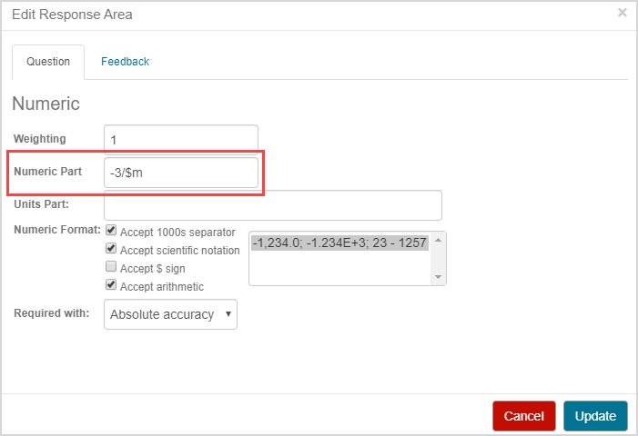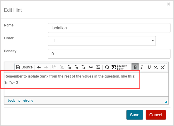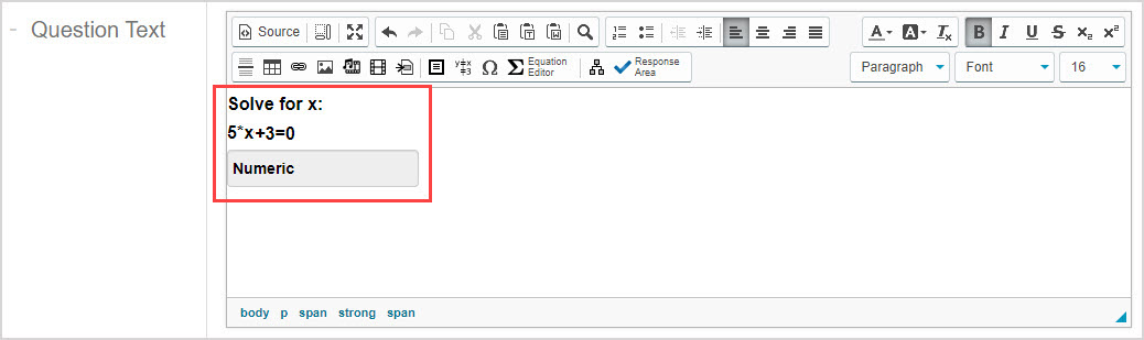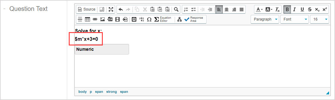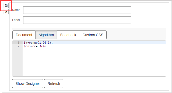 After creating your algorithm in step 3, navigate back to the Question Text pane and replace the fixed values in the question with the variable names that you defined in your algorithm. Example — The 5 in the static question of 5*x+3=0 is replaced with $m which is defined by the function $m=range(1,20,1);.