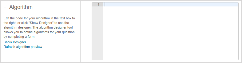- Algorithm Designer — Create algorithmic command lines without directly using algorithmic syntax (check out Create question algorithms using the Algorithm Designer).