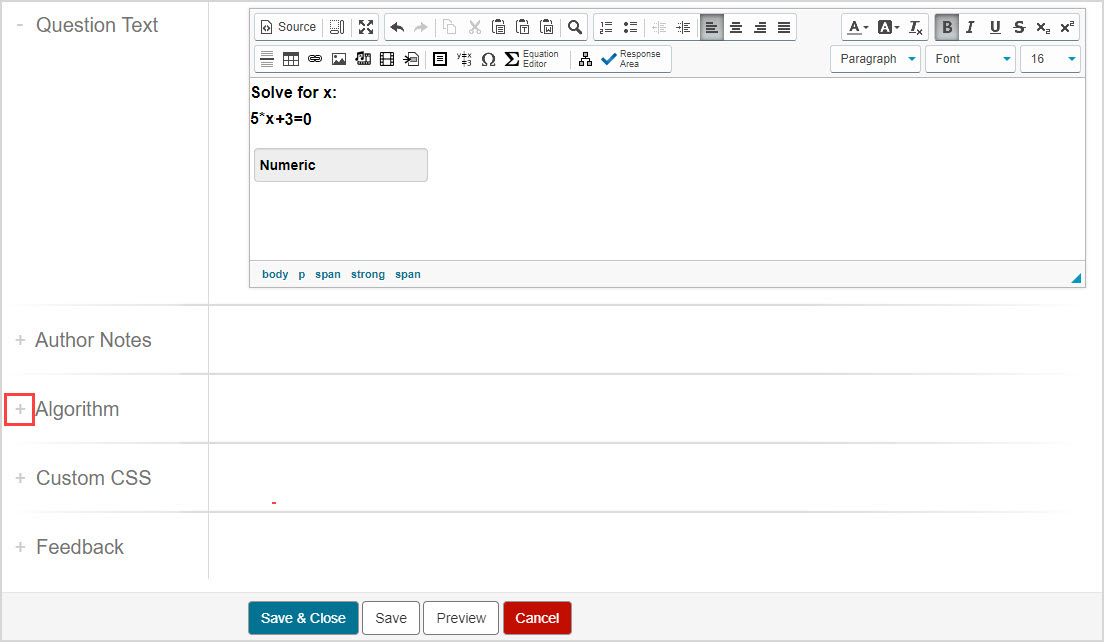 Algorithmic questions are authored the same way any non-algorithmic question is authored from the Question Editor.