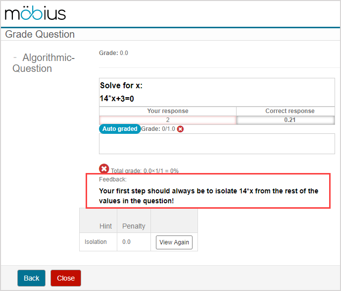 NOTE: Algorithmic variable values are recorded permanently in the Gradebook. When students or instructors review the graded activity, the exact variable values that were included in the attempt being investigated are maintained.