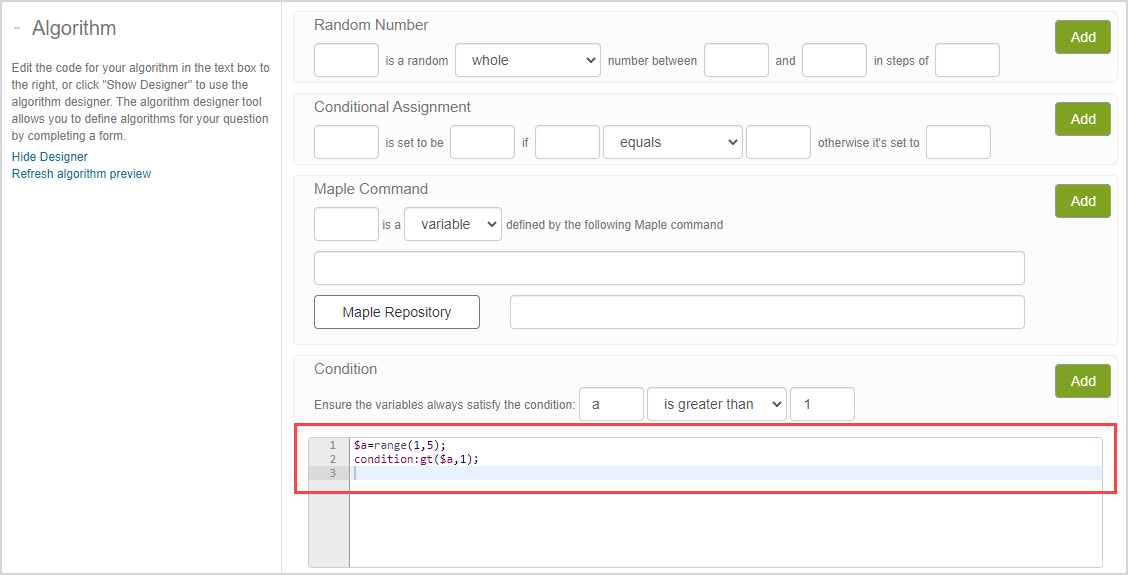 $a=range(2,5);TIP: Conditions can't always be eliminated from your algorithm (Example — a condition would be required if your algorithm is generating random numbers x and y with the requirement that |x^2*y/(x^4+y^2)| be less than 0.48). Conditions should be placed as early as possible within your algorithm when they can't be eliminated. Since the maple("...") function is often used to perform complex calculations, it should be placed after the last condition since this means that all of the algorithm's conditions have been met by the time the maple("...") function is applied.
