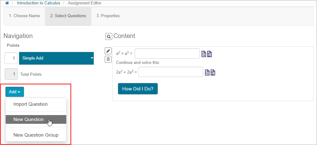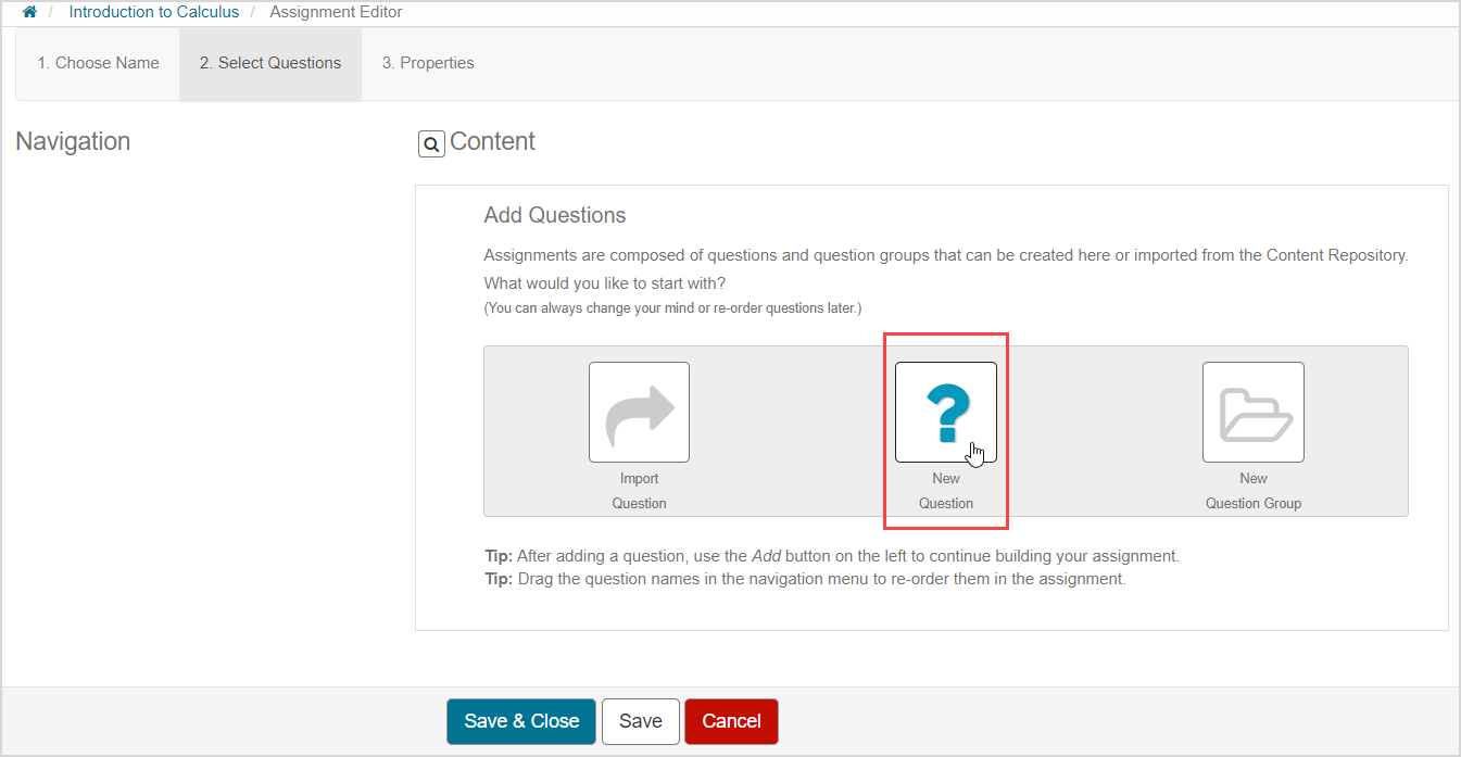 NOTE: For an assignment, you'll author new questions in the 2. Select Questions tab of the Assignment Editor. If you're working in an empty assignment, click the New Question shortcut.