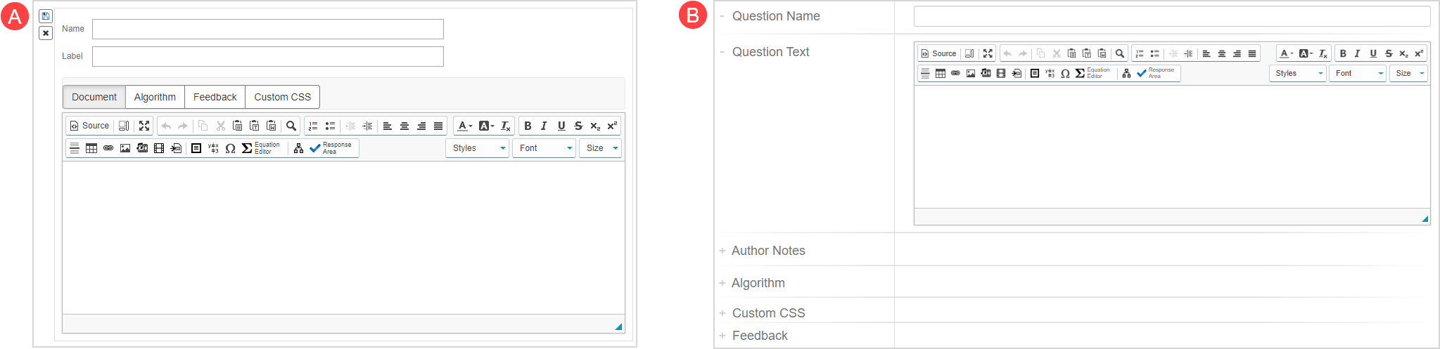 NOTE: (A) The Question Editor within an Activity Editor has a modified layout but identical functionality compared to the (B) Question Editor accessed from the Content Repository. The components of the Question Editor are arranged into (A) tabs in the Activity Editors, but are displayed as (B) panes when accessed from the Content Repository.