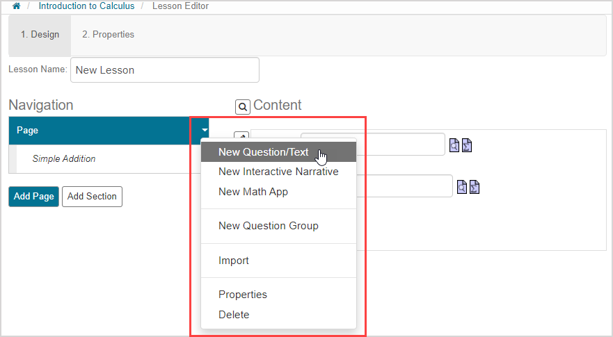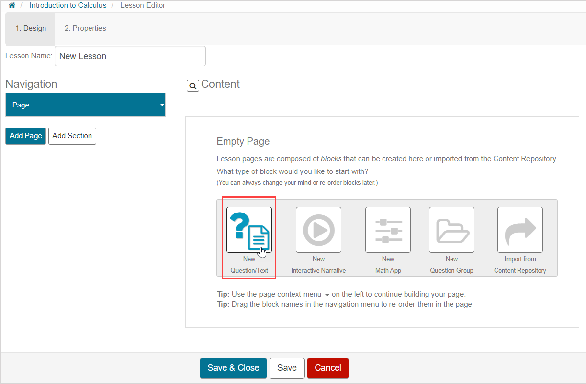 NOTE: For a lesson, you'll author new questions in the 1. Design tab of the Lesson Editor. If you're working in an empty lesson, click the New Question/Text shortcut.