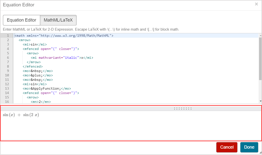NOTE: A preview is displayed below the text field based on your MathML or LaTeX code.