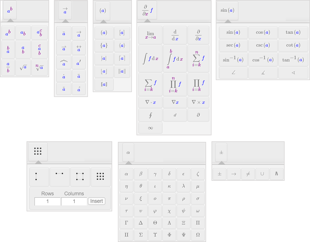 You can also use MathML or LaTeX to enter symbolic math expressions instead of using palettes.