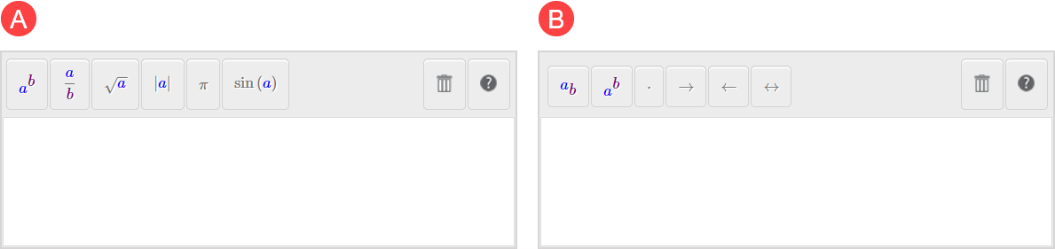 NOTE: The palettes that are available in the student Equation Editor are determined by the type of question you've authored. Example — Here are the student Equation Editors if you've authored a (A) formula sub-type of the mathematical formula question or a (B) chemical equation sub-type of the mathematical formula question: