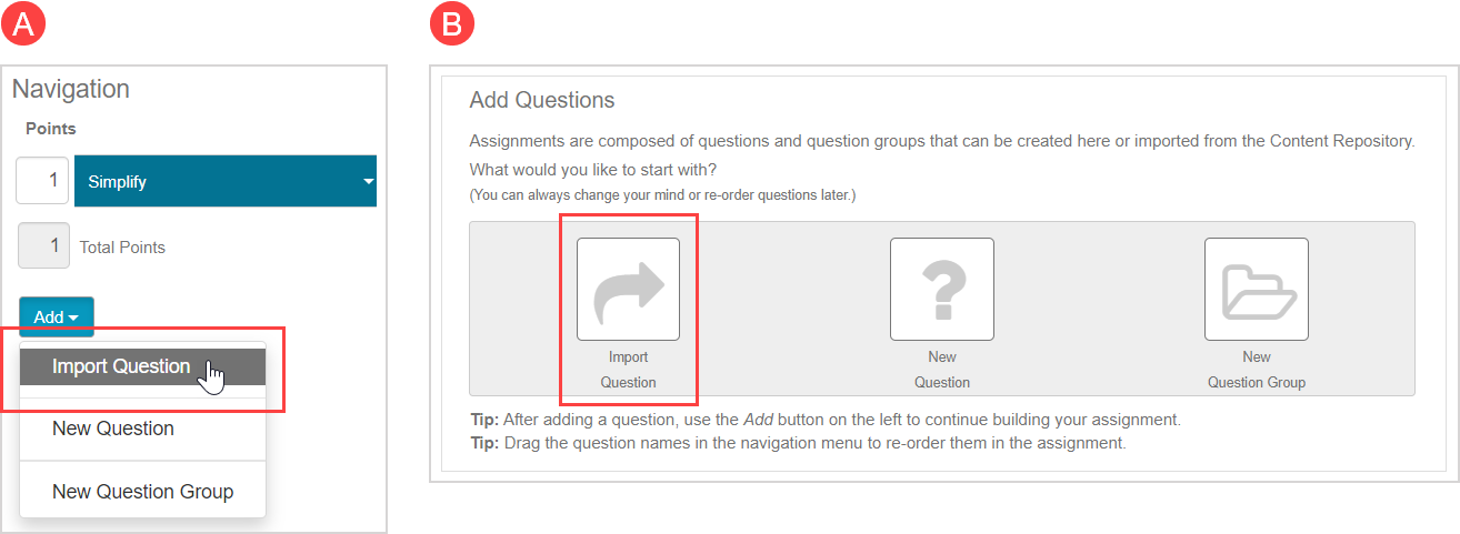 1. Click Import Question from the (AAdd Questions pane or (B) Add drop-down list (if content already exists in your assignment).
