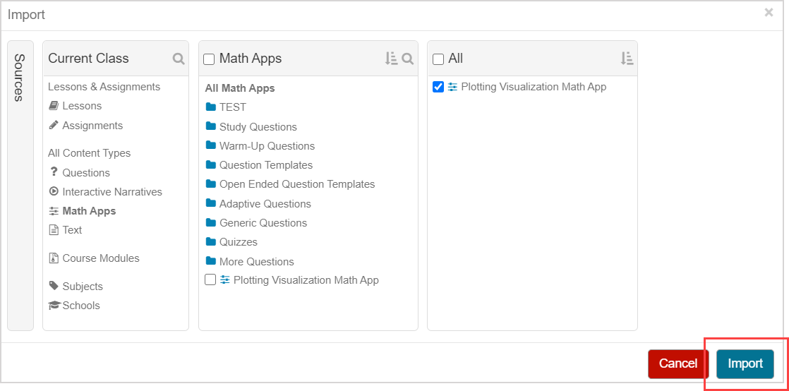 1. Select the check box of the Math App that you want to import into your lesson and click Import.