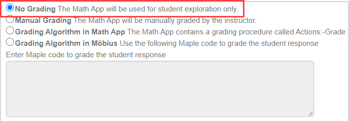 1. Follow the instructions for Author a Math App question, but be sure to select No Grading for the Math App component.