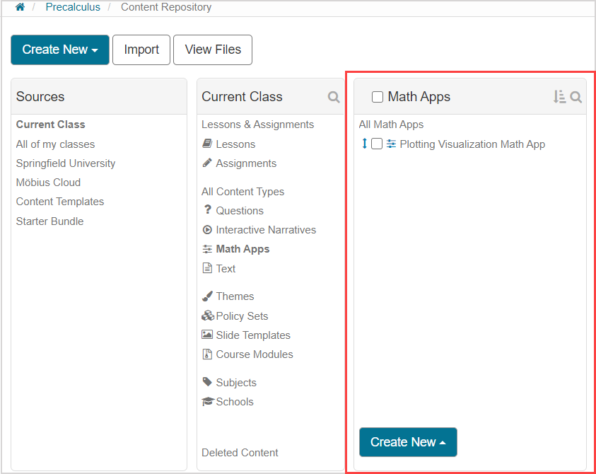 TIP:Möbius Content Packs contain pre-built Math Apps (without grading procedures) that you can import into your class! You can include these Math Apps in your activities instead of building your own for ungraded exploration by your students. Check out Import a Content Pack.