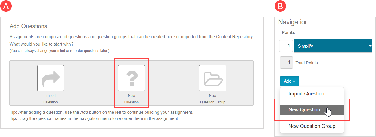 1. Click New Question from the (A) Add Questions pane or (B) Add drop-down list (if content already exists in your assignment) to author a new question that contains an exploratory ungraded Math App.