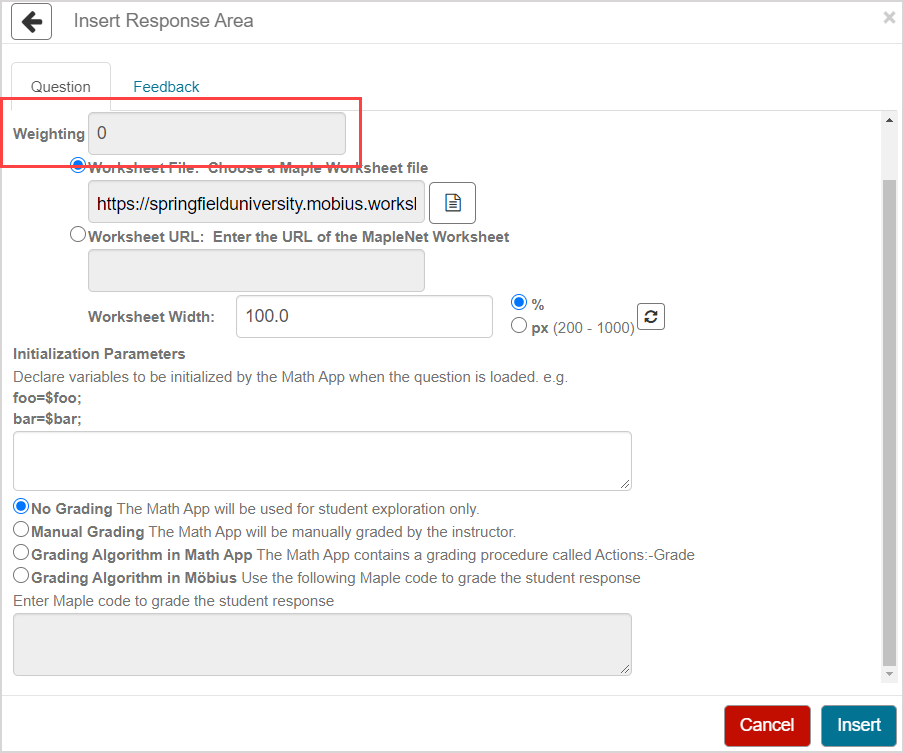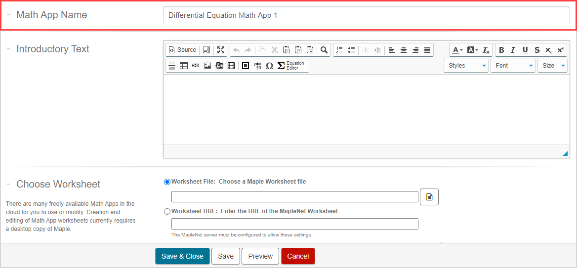 • If you have access to a MapleNet server, select the Worksheet URL option and enter the MapleNet URL of your Math App worksheet.