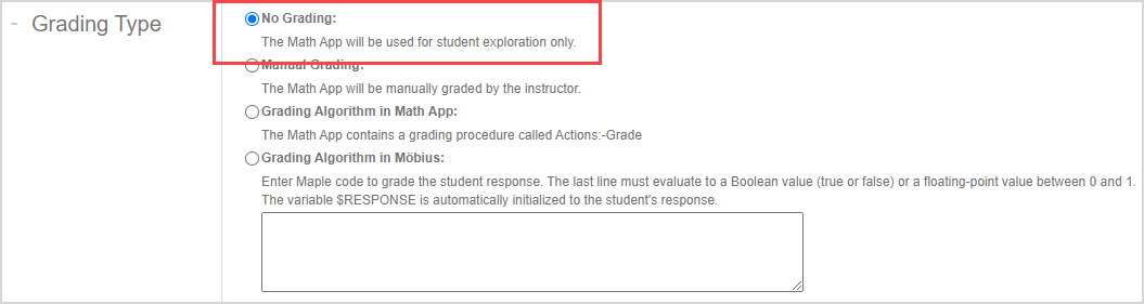1. Select the No Grading radio button for the type of grading for the Math App.