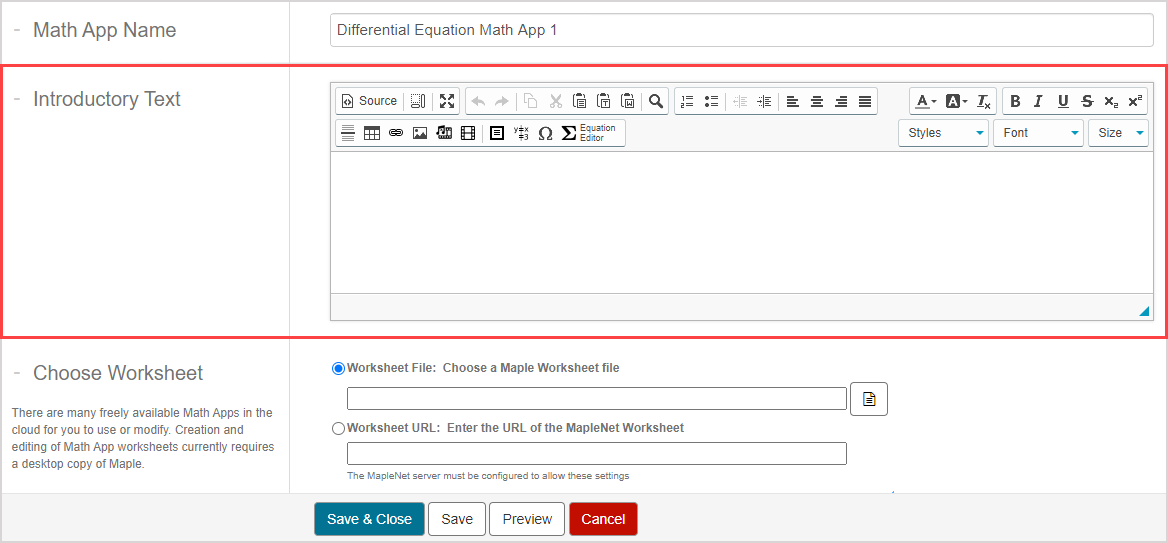 1. (Optional) Enter a introductory text if instructional information is missing from the Math App's Maple worksheet that you'll be using.