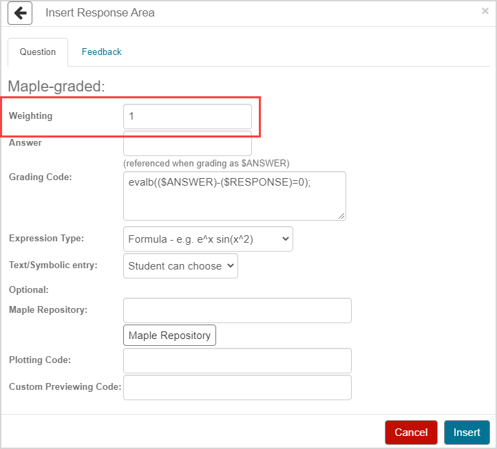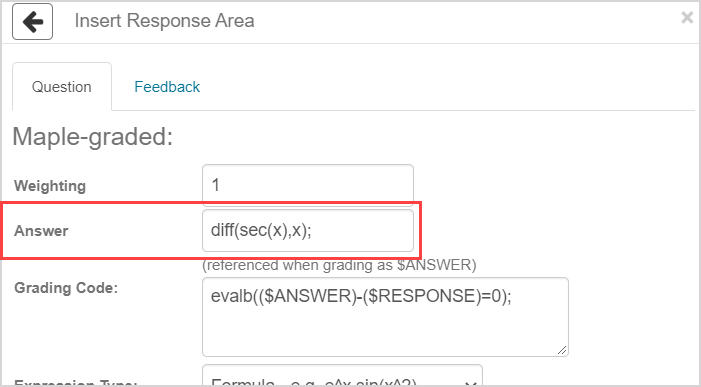 IMPORTANT: Your students won't be able to tell if a question is authored as a Maple-graded Maple syntax question. You'll need to provide explicit instructions in your question statement if Maple syntax is required for their response.