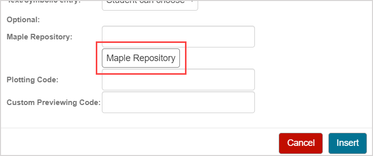 (Optional) Click Maple Repository to upload a Maple library from your personal Maple library archives into your question. The file path to your library will autofill after selecting it from your repository.
