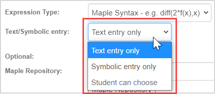 - Did you select Maple Syntax as the expression type at step 7? Then you'll choose if the question requires the student to use Text entry only or Symbolic entry only.