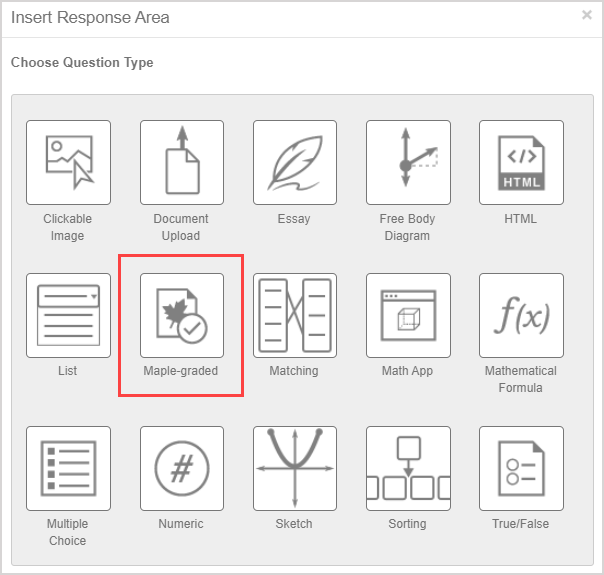 You can choose from two Maple-graded question sub-types when authoring a Maple-graded question.