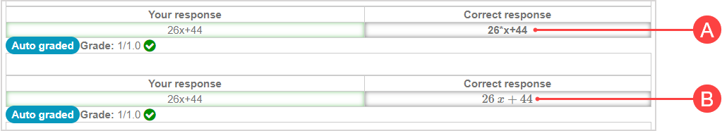 Maple-graded questions automatically accept all equivalent responses as correct answers (unless otherwise defined by your custom grading code).