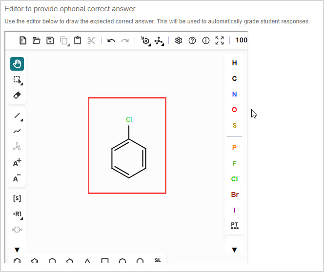 The question is automatically graded if a chemical structure is provided in the Editor to provide optional correct answer.