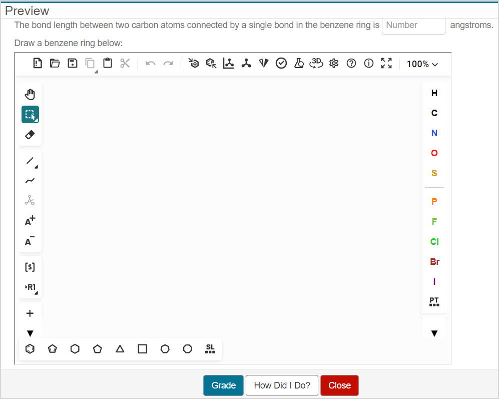 NOTE: Previewing your question is the best way to see the drawing tools available to the student. Check out the Ketcher documentation website for more details on each of the drawing tools available in the Ketcher sketch area.