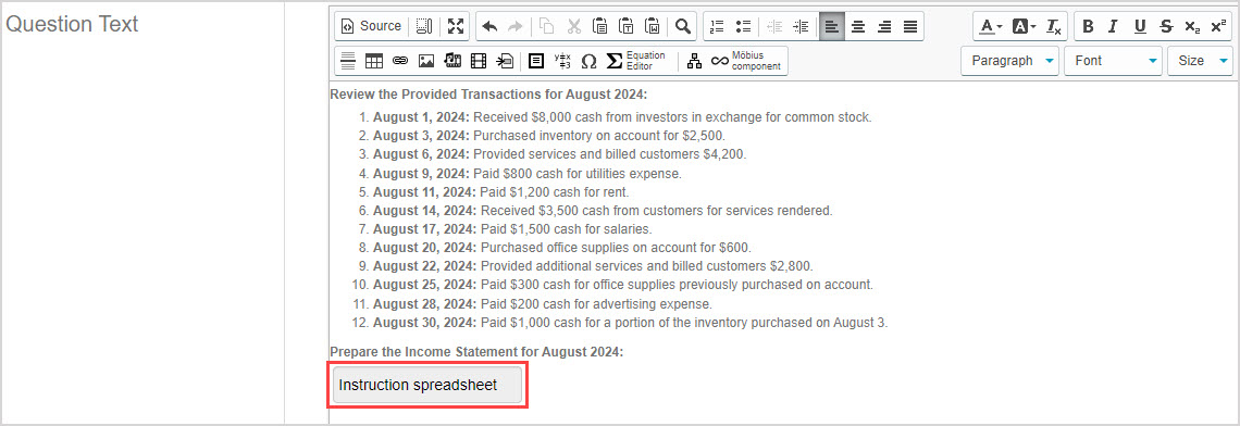 TIP: This instructional component doesn't count towards the grade for the question. Check out Author a spreadsheet question for details on adding a spreadsheet component that can be automatically or manually graded.