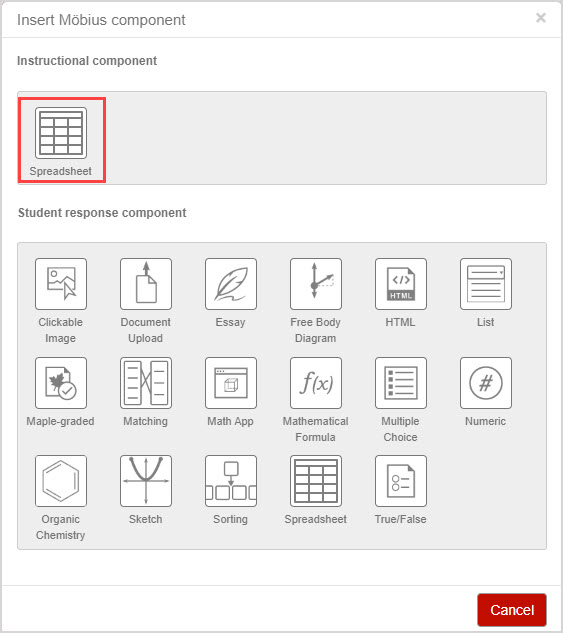 A spreadsheet instructional component allows the author to enter data and perform calculations in Möbius, with the details to be made available for students to interact with during their activity attempt.