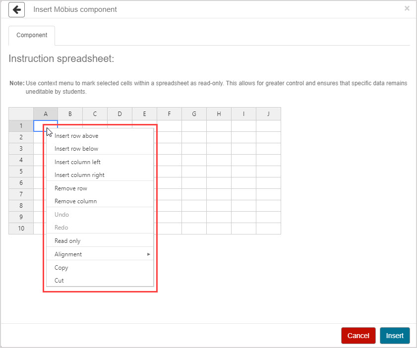 - Read only — Lock the contents of the selected cell(s) so they can't be changed by students answering the question.