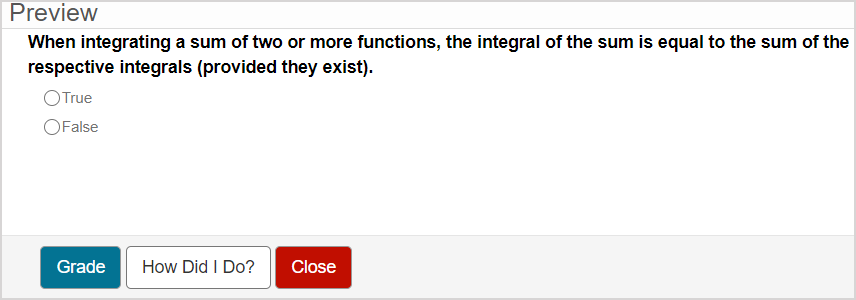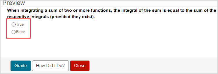 TIP: The visual display of the answer choices for a true or false question always appear listed in the same order, with True being listed first and False being listed second.